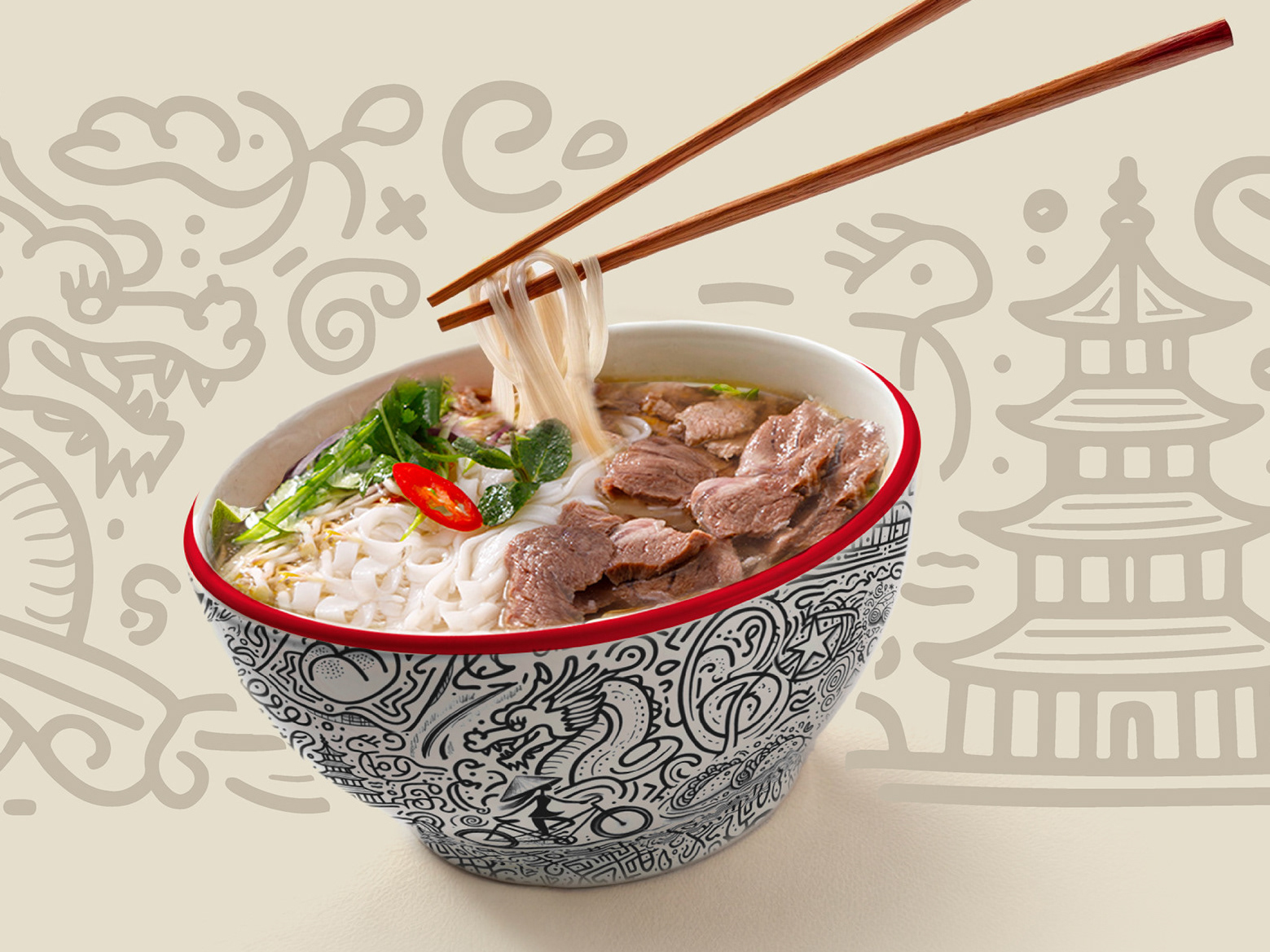 An illustrated soup bowl design created for a Vietnamese restaurant, translating interior graffiti-style artwork into a functional, production-ready ceramic object.
