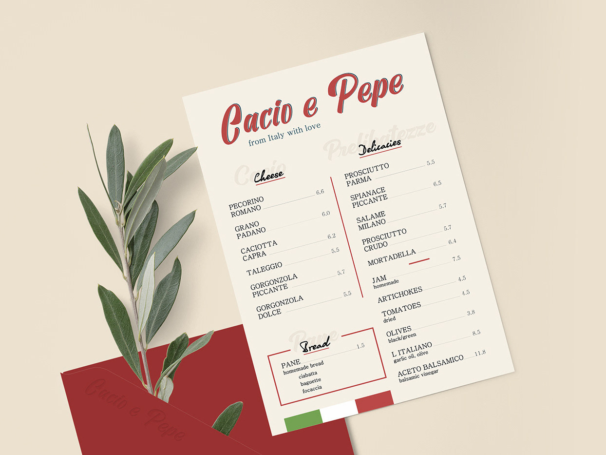 Brand identity and visual system for an Italian restaurant inspired by Roman cuisine, designed to work across menus, packaging, signage, and promotional materials.